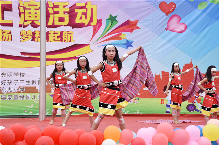 緊接著,精彩紛呈的文藝匯演在光明學(xué)校高段年級組的《開門紅》舞蹈中拉開序幕。隨后,舞蹈《glass》、《我是紅領(lǐng)巾》、葫蘆絲合奏《荷塘月色》、舞蹈《串燒》、《花衣裳》、《中華孝道》、《匕首操》、《阿拉伯之夜》、武術(shù)《精忠報國》、舞蹈《青春集合在軍旗下》等11個精彩節(jié)目相繼亮相。