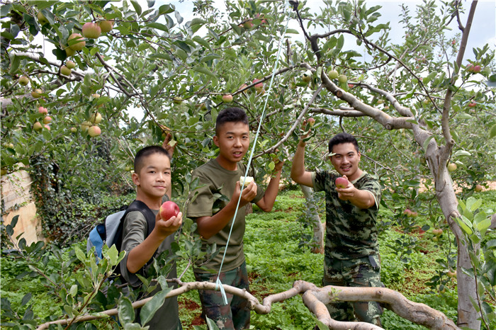 依依不舍地下山,我們來(lái)到了綠色而生態(tài)的有機(jī)蘋果基地,聽(tīng)聞此基地的蘋果知名度很高,都是來(lái)自昭通大山里的優(yōu)質(zhì)品種,聽(tīng)到這里,孩子們?cè)缫汛烬X生津,正是烈日當(dāng)空,清甜脆爽的蘋果無(wú)疑是消暑佳品。“想吃蘋果就要自己動(dòng)手喲!”一聲號(hào)令,孩子們已經(jīng)紛紛鉆進(jìn)蘋果林中,各顯其能,大快朵頤起來(lái)。品嘗著親自勞動(dòng)得來(lái)的碩果,孩子們滿足地吃著鬧著,這一刻,他們似乎品嘗到的是辛勤勞動(dòng)的快樂(lè),較之蘋果本身的美味,這份滋味更值得孩子們?cè)谌松拿恳浑A段細(xì)細(xì)品味。