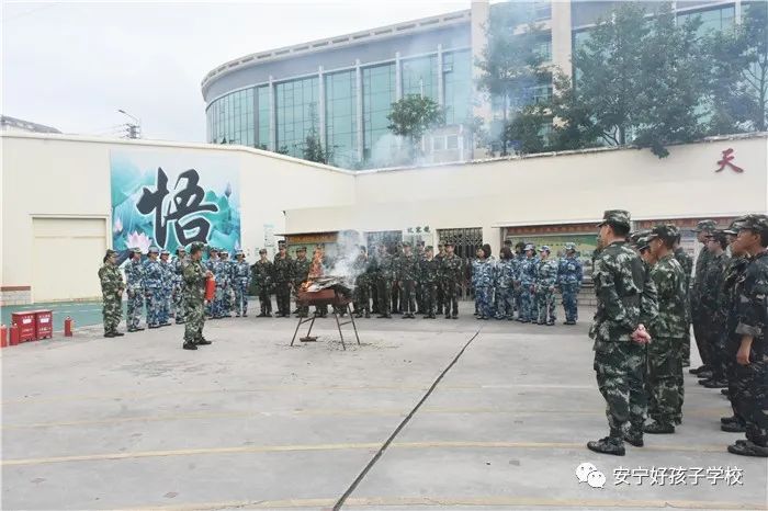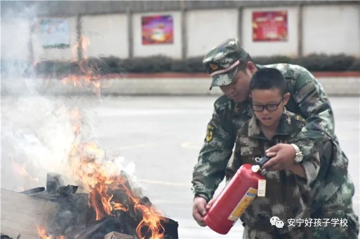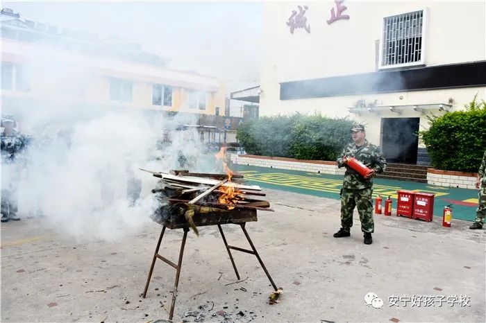 接著開始了消防撲救演練。操場上的木材點燃后,火苗迅速變成了熊熊大火,老師開始現(xiàn)場演示滅火設(shè)備(滅火器、高壓水槍、滅火毯、濕毛巾)的使用方法,并指導(dǎo)全部學(xué)生親自操作演練。
