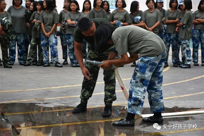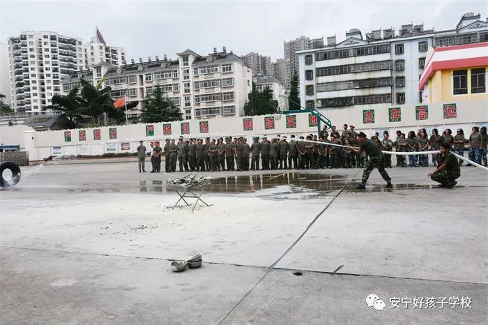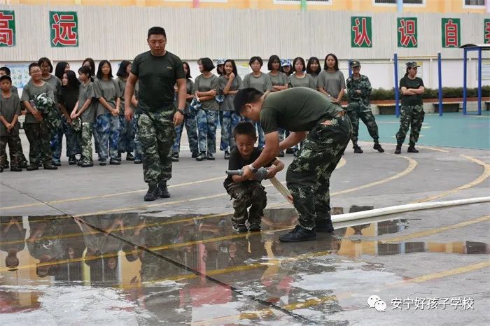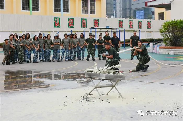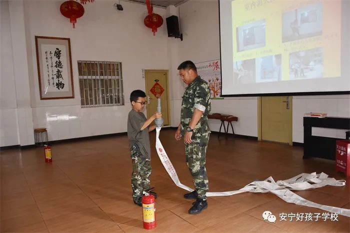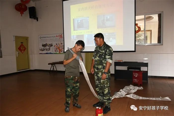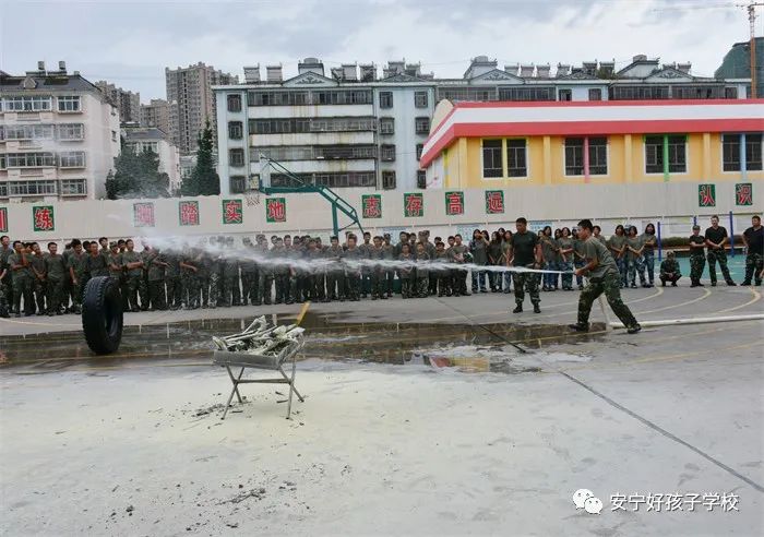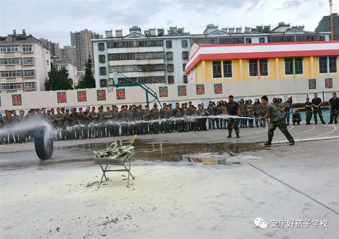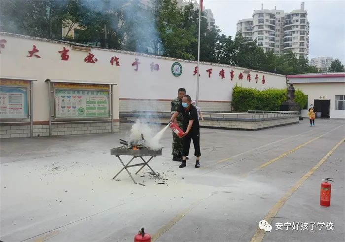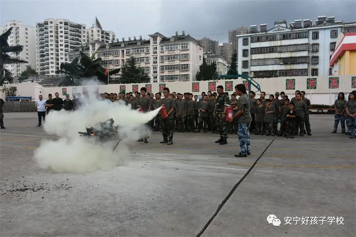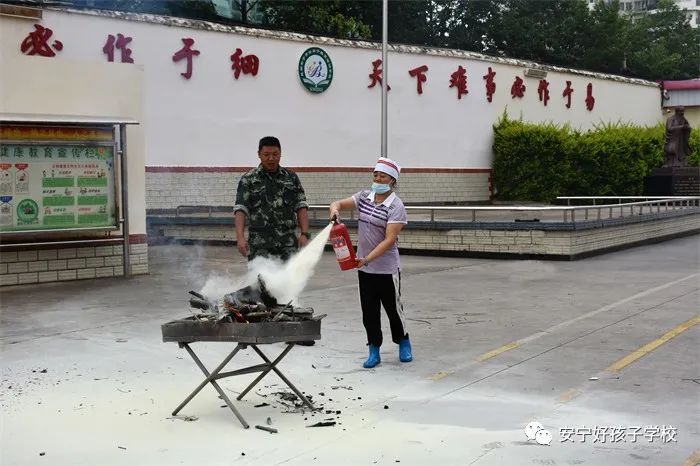 最后,進(jìn)行了撲救演練。操場(chǎng)上的木材點(diǎn)燃后,火苗迅速變成了熊熊大火,老師開(kāi)始現(xiàn)場(chǎng)演示滅火設(shè)備(滅火器、高壓水槍?zhuān)┑氖褂梅椒,并指?dǎo)全部學(xué)生親自操作演練。
