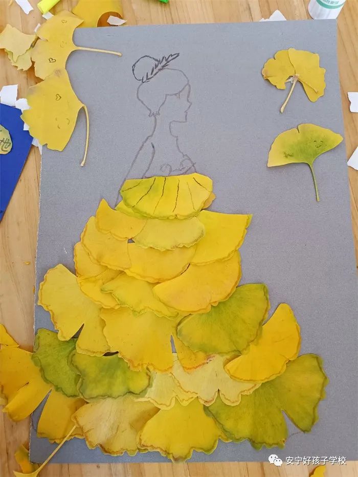 活動中,師生們熱情高漲,全身心投入制作。通過壓平、粘貼、晾干等方法,巧妙地利用不同顏色和形狀的樹葉,或是平鋪制圖,或是層層疊加,在卡片上繪制圖案。很快,一片片不起眼的葉子,經過一雙雙巧手的精心雕琢,便成了一件件栩栩如生的藝術品,有舞者、公主裙、圣誕樹、花朵等銀杏畫,有的孩子還在葉子上寫下了滿滿的祝福和對未來的憧憬。一片片銀杏葉頓時像被賦予了生命一樣,鮮活起來。