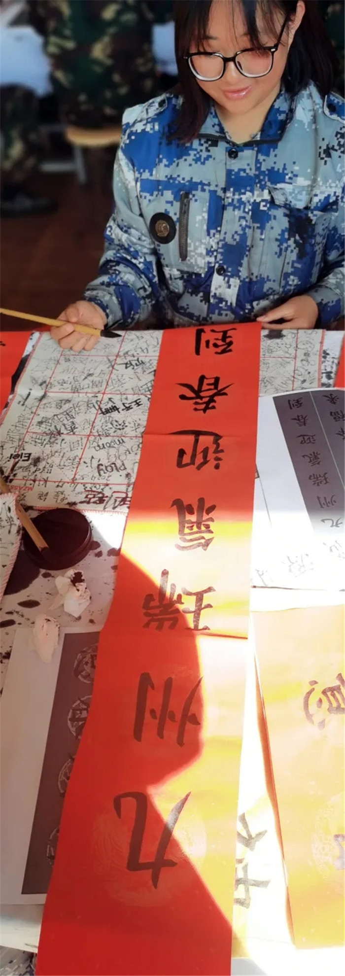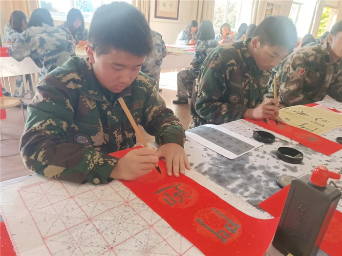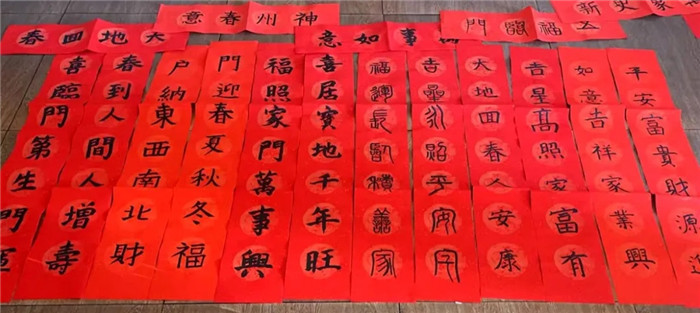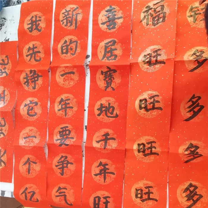 春聯(lián)紙上,孩子們筆走龍蛇。有的筆法雖顯稚嫩,卻充滿童趣;有的運(yùn)筆嫻熟,字體剛勁有力。春聯(lián)內(nèi)容豐富多樣,有贊頌祖國繁榮昌盛的豪邁之語,有抒發(fā)家庭幸福美滿的溫馨之言,還有祈求學(xué)業(yè)進(jìn)步的懇切之詞。不一會(huì)兒,一副副對仗工整、寓意吉祥的精妙詞句便在同學(xué)們的筆下應(yīng)運(yùn)而生,傳遞出的皆是對新年的美好祝愿。老師寫的福字更是獨(dú)具特色,雄渾大氣,無不飽含著對幸福生活的美好向往,F(xiàn)場,紅彤彤的紙張映照著孩子們燦爛的笑顏,新春的喜悅氣息如春風(fēng)般撲面而來。