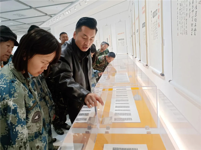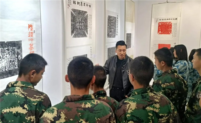展覽突破傳統(tǒng)范式,兩位書(shū)法家創(chuàng)造性運(yùn)用“拓片為經(jīng),題跋為緯”的展陳邏輯,以篆、隸、楷、行、草不同書(shū)體題寫(xiě)跋文,既有魏碑雄強(qiáng)筆勢(shì)與粗獷拓痕的張力碰撞,也不乏娟秀小楷與細(xì)膩紋飾的和諧共生。通過(guò)章法疏密、墨色濃淡的匠心,為師生呈現(xiàn)了一場(chǎng)跨越千年的文化盛宴,讓師生在斑駁的拓片肌理間遇見(jiàn)文明密碼,于翰墨丹青間傳承文化基因,感受“一紙拓千秋”的文化魅力。