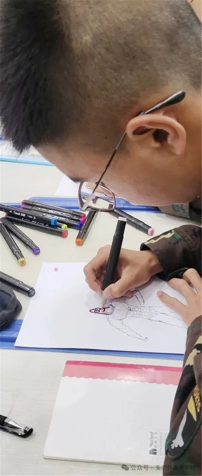 在“我手繪我心”創(chuàng)作環(huán)節(jié),藝術(shù)成為了孩子們表達(dá)內(nèi)心的獨(dú)特語言。有的同學(xué)用細(xì)膩筆觸勾勒寫實(shí)自畫像,將外在形象與內(nèi)在性格巧妙融合;有的用繽紛色彩堆砌出奶油蛋糕,讓甜蜜的渴望在紙面流淌;有的繪制身著偶像球衣的自己,展現(xiàn)逐夢路上的堅定身影;更有的勇敢以灰調(diào)筆觸直面內(nèi)心的陰霾,讓迷茫與困惑在創(chuàng)作中得到溫柔安放。正如維特根斯坦所言:“語言的界限即世界的界限!碑(dāng)文字難以精準(zhǔn)描繪抽象、隱秘的情感時,畫筆便成為了傾訴內(nèi)心的專屬語言。創(chuàng)作過程中,孩子們時而凝神思索,時而揮筆疾書,那些原本模糊的“心的形狀”逐漸清晰可見。